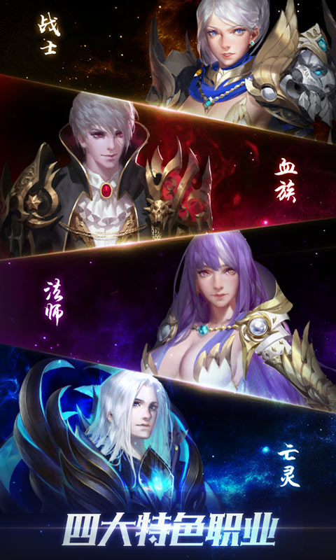经典职业 谱写魔幻史诗 战士,法师,血族,死灵;经典职业3D高清重现,血影轮回,飞天连斩,经典技能打造手游至强打击感!