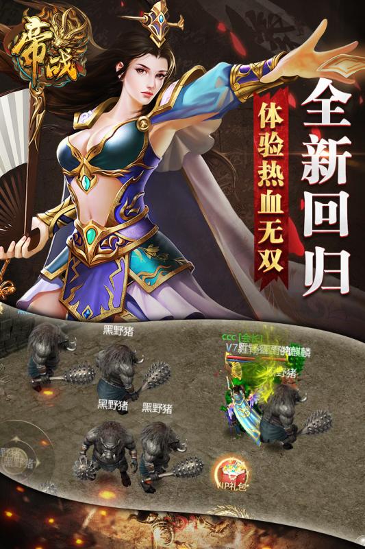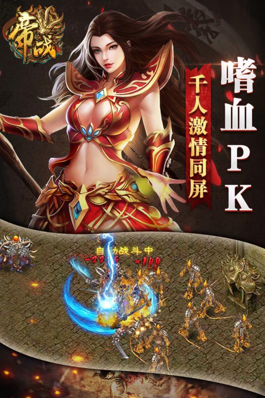 《帝战OL》是一款经典MMORPG2D热血传奇类手游,战法道经典三职业,携兄弟齐心战天下,十载传奇梦,同样的千人攻沙,不一样的打怪爆装,回味激情飞扬的年代,在烈火中重生,重夺沙城荣耀,这是属于我的世界。