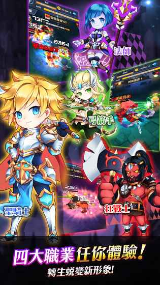 「圣骑士」、「狂战士」、「弓箭手」、「法师」四大职业可选择,不同职业乐趣将会大不相同,快来挑选最适合你的职业!
