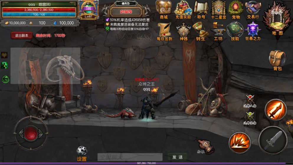 天罚:50%机率触发天罚,对怪物造成10倍伤害 神器系统:30种神器让你收集 武器项链加幸运,幸运满9刀刀满攻 翅膀、复活、宠物、交易系统、十二星宫各种不同的玩法等你来战!!!