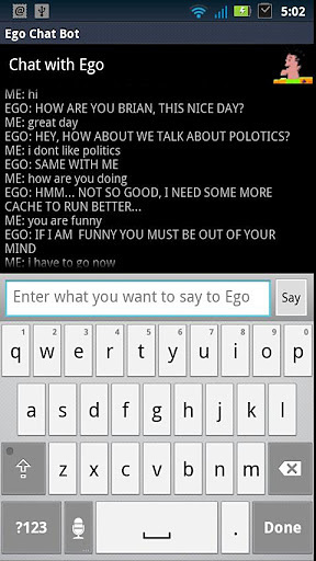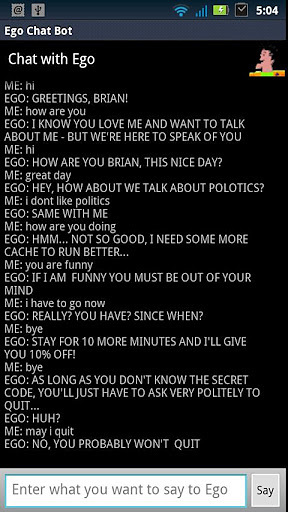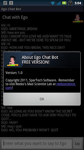 FromthehomeofReeko'sMadScientistLab,wepresentthewebsite'sstarattractioninaformatyoucanenjoyonyourmobiledevice.MeetEgo,thelabrobot.Egoisachatbot,aartificialintelligencesoftwareapplicationthatallowsyoutotext(chat)withhimandreceivereal-timecommunicationsback.Bewarnedthough,Egocommunicatesinamannerthatbefitshisname.Egocanbefriendlyandfunnyorhecanbeegotisticalandrude-italldependsonhismoodatthetime.Lovehimorhatehim-you'llhaveablastchattingwithEgoandwillinevitablywonder,isheachattingrobotorarealperson? 【基本信息】