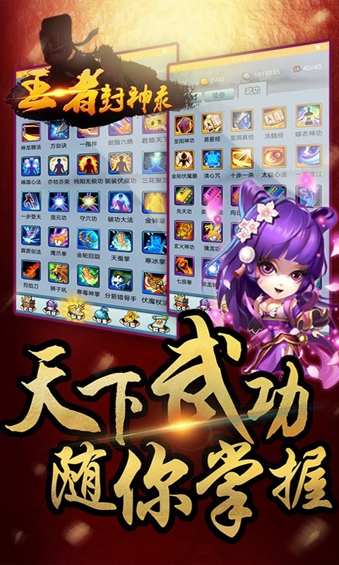 1、最炫视觉 精妙绝伦 知名画师倾力设计的精美人物让人过目难忘,华丽的武功展示招数精妙又不失霸气。 2、最炫招式 谁与争锋 乾坤圈、大圣棒法、水漫金山、君临天下,所有经典神仙招式,游戏中都针对做了不同的演绎方式,全新的绝招展现,给你一场真正的招式盛宴!而独创的连招体系更是让战斗激爽度飙升! 3、最炫神兵 琳琅满目 百余种隐秘于天下多年的神兵宝甲、法术秘籍等你探寻,不同法术和道具之间的千变万化组合,带给你完美游戏体验。 4、最炫机缘 千丝万缕 多个神仙豪侠之间存在千丝万缕的关系,哪吒和孙悟空以及白骨精还有怎样的故事?千丝万缕的隐藏关系设定令你的杀伤力再上台阶,形成更强大的战斗阵容。 5、最炫活动 绝不坑爹 每日登陆必送元宝,所有装备技能均可掉落。奇遇系统更是惊喜不断,更多精彩活动每天开启。元宝,道具每日送不停!