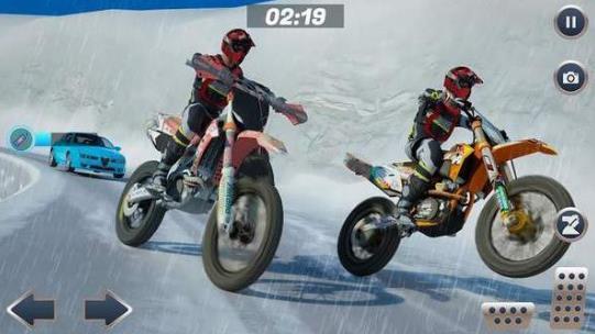 游戏采用物理引擎模拟真实的雪地行驶效果,包括雪地摩擦力、摩托车的跳跃和翻滚等。