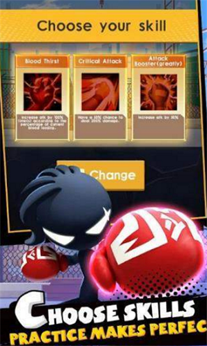 火柴拳击解锁新角色和战斗技能,升级效果,升级角色等级,改变不同场景,开始新游戏;