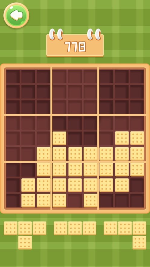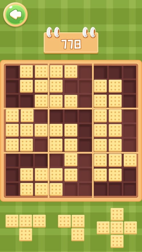 2、或者是横纵9个连续的格子被饼干填满,也可以消除掉横纵的9个格子,当饼干盒的空间放不下饼干的时候。