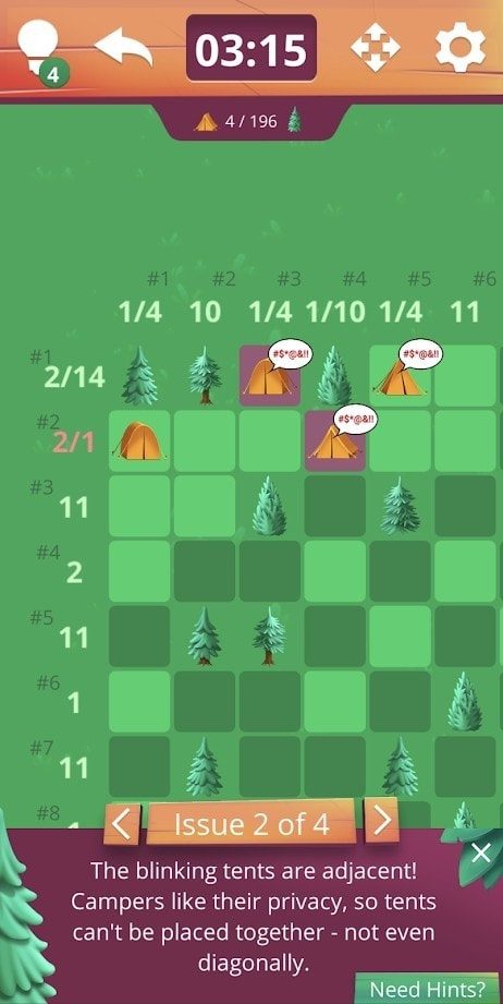 1,在此游戏中,玩家需要在地图上放置树木和帐篷,您只能通过将其放置在正确的位置来解锁更多的关卡。